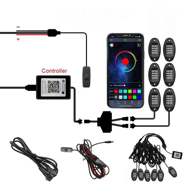 Sættet består af 6 kraftige vandtætte ROCK LED med hver 16 multicolor LED