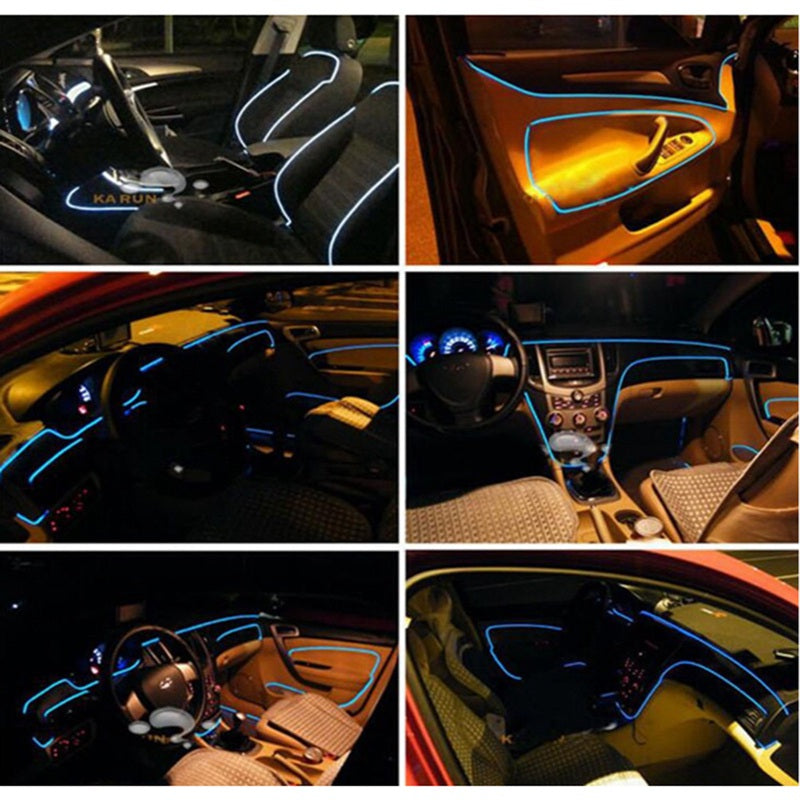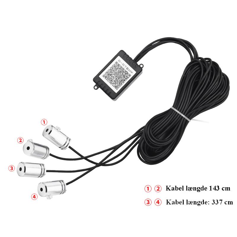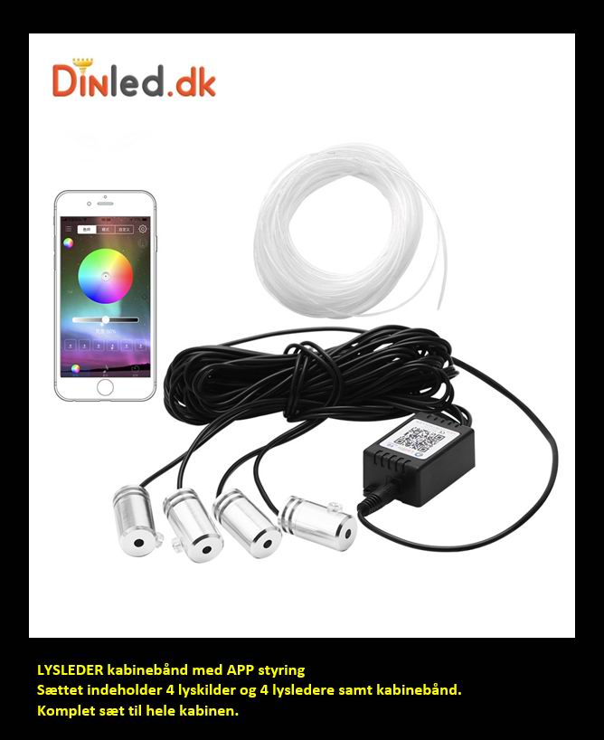 Du får et komplet sæt med 4 lys kilder, 5 meter lysleder, 5 meter kabinebånd samt controller. Lysleder og kabinebånd klippe, så de passer perfekt til instrumentpanelet, døre m.m.