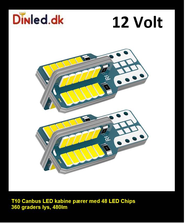 T10 W5W CANBUS LED pære 48LED - sæt med 2 stk., 12v