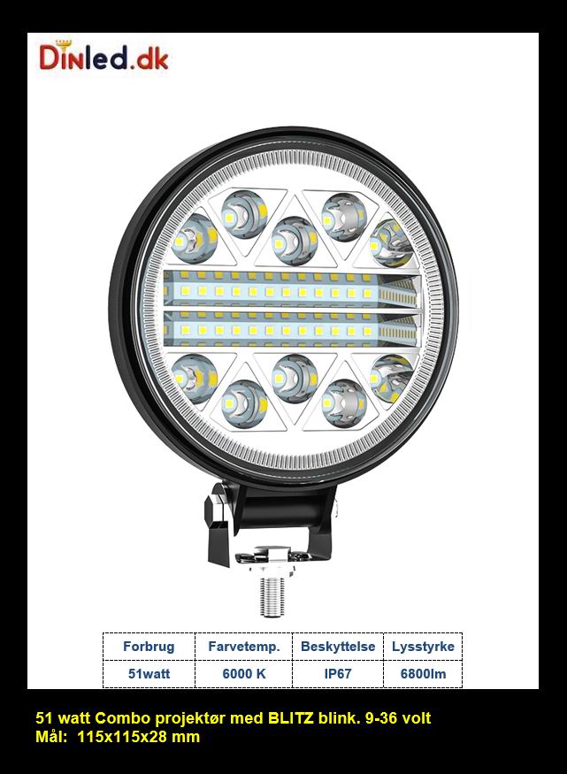 LED køretøjs projektør 51 watt COMBO, med BLITZ blink