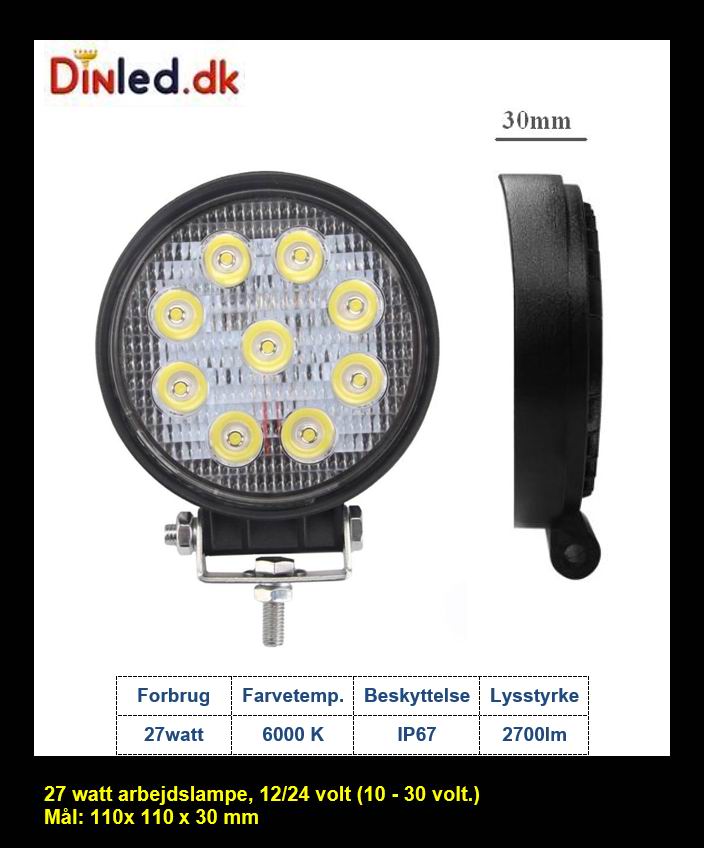 Slim LED køretøjs projektør 27 watt 12/24 volt (10-30 volt)