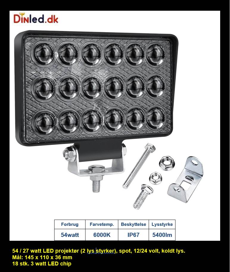 LED køretøjs projektør 54 / 27 watt SPOT, 12/24/48 volt (10 - 80 volt)